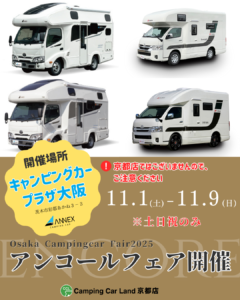 先日の大阪キャンピングカーフェア2025では、大勢の方にご来場いただきまして、ありがとうございました! アンコールフェア開催いたします★ 今回の開催場所はキャンピングカープラザ大阪です! 11/1から11/9の間 土日祝のみ開催いたします。 京都店からも展示車を移動しますので、たくさんの車両を見ていただけますよ◎ 気になるお客様はぜひご来場ください♪ 一覧に戻る